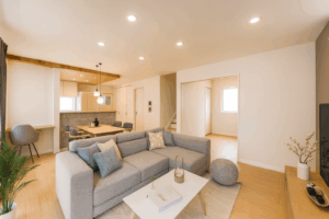 ナチュラルなリネンカラーと木目調の質感がやさしく調和する、ほっと心がほどける住まい。