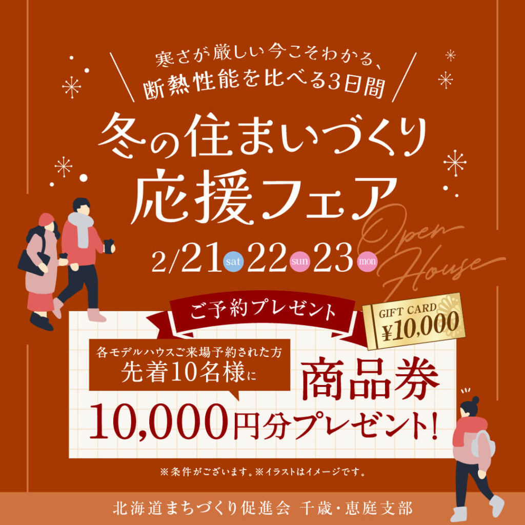 ※商品券は後日発送となります ※モデルハウス見学のうえアンケートご記入が条件となります ※期間中に2棟以上見学いただいた場合でも、1組様1回限り(最大10,000円分)の進呈となります